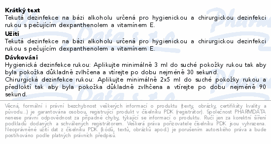 Tekutá dezinfekce na bázi alkoholu určená pro hygienickou a chirurgickou dezinfekci rukou s pečujícím dexpanthenolem a vitamínem E.
