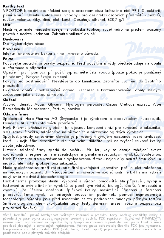 VIROSTOP biocidní dezinfekční sprej s extraktem cistu krétského ničí 99,9 % bakterií, plísní a virů. Obsahuje aloe vera. Vhodný i pro dezinfekci osobních předmětů - mobilů, roušek, volantu, kliky, klíčů, plat. karet. Obsahuje ethanol: 638,7 g/l.