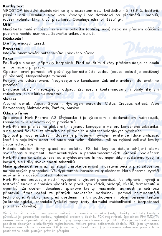 VIROSTOP biocidní dezinfekční sprej s extraktem cistu krétského ničí 99,9 % bakterií, plísní a virů. Obsahuje aloe vera. Vhodný i pro dezinfekci os. předmětů - mobilů, roušek, volantu, kliky, klíčů, plat. karet. Obsahuje ethanol: 638,7 g/l.