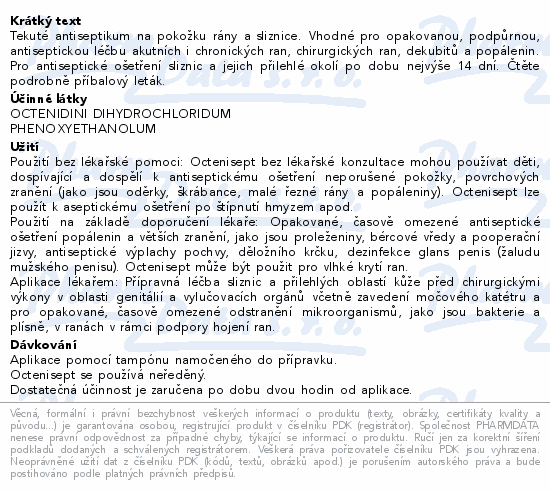 Tekuté antiseptikum na pokožku rány a sliznice. Vhodné pro opakovanou, podpůrnou, antiseptickou léčbu akutních i chronických ran, chirurgických ran, dekubitů a popálenin. Pro antiseptické ošetření sliznic a jejich přilehlé okolí po dobu nejvýše 14 dní. Čtěte pozorně příbalový leták.