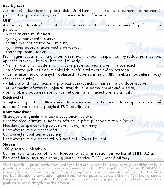Alkoholový dezinfekční prostředek Sterillium na ruce s obsahem komponentů pečujících o pokožku a vynikajícím remanentním účinkem.