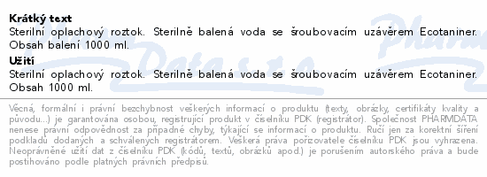 Sterilní oplachový roztok. Sterilně balená voda se šroubovacím uzávěrem Ecotaniner. Obsah balení 1000 ml.