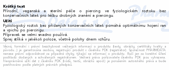 Přírodní, veganská a sterilní péče o piercing ve fyziologickém roztoku bez konzervačních látek pro léčbu drobných zranění a piercingu.