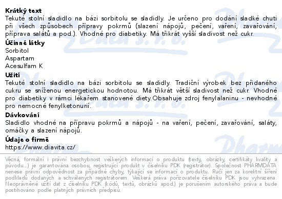 Tekuté stolní sladidlo na bázi sorbitolu se sladidly. Je určeno pro dodání sladké chuti při všech způsobech přípravy pokrmů (slazení nápojů, pečení, vaření, zavařování, příprava salátů a pod.). Vhodné pro diabetiky. Má třikrát vyšší sladivost než cukr.