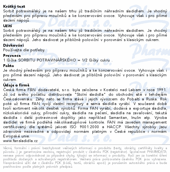 Sorbit potravinářský je na našem trhu již tradičním náhradním sladidlem. Je vhodný především pro přípravu moučníků a ke konzervování ovoce. Vyhovuje však i pro přímé slazení nápojů.
