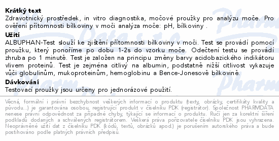 Zdravotnický prostředek, in vitro diagnostika, močové proužky pro analýzu moče. Pro ověření přítomnosti bílkoviny v moči analýza moče: pH, bílkoviny .