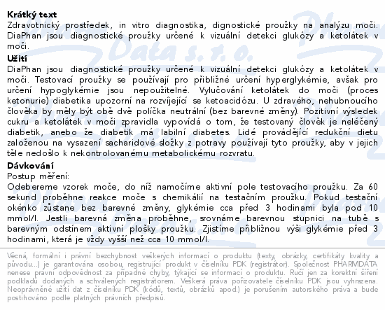Zdravotnický prostředek, in vitro diagnostika, dignostické proužky na analýzu moči. DiaPhan jsou diagnostické proužky určené k vizuální detekci glukózy a ketolátek v moči.