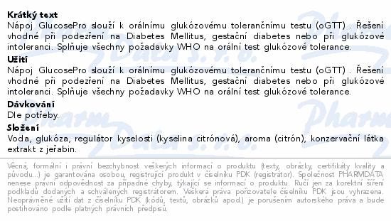 Nápoj GlucosePro slouží k orálnímu glukózovému tolerančnímu testu (oGTT) . Řešení vhodné při podezření na Diabetes Mellitus, gestační diabetes nebo při glukózové intoleranci. Splňuje všechny požadavky WHO na orální test glukózové tolerance.