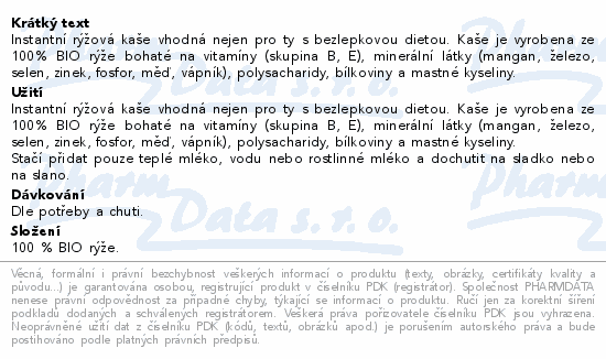 Instantní rýžová kaše vhodná nejen pro ty s bezlepkovou dietou. Kaše je vyrobena ze 100% BIO rýže bohaté na vitamíny (skupina B, E), minerální látky (mangan, železo, selen, zinek, fosfor, měď, vápník), polysacharidy, bílkoviny a mastné kyseliny.