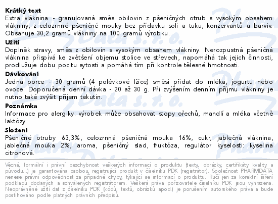 Extra vláknina - granulovaná směs obilovin z pšeničných otrub s vysokým obsahem vlákniny, z celozrnné pšeničné mouky bez přídavku soli a tuku, konzervantů a barviv. Obsahuje 30,2 gramů vlákniny na 100 gramů výrobku.