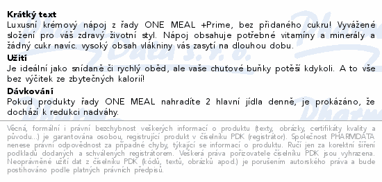 Luxusní krémový nápoj z řady ONE MEAL +Prime, bez přidaného cukru! Vyvážené složení pro váš zdravý životní styl. Nápoj obsahuje potřebné vitamíny a minerály a žádný cukr navíc. vysoký obsah vlákniny vás zasytí na dlouhou dobu.