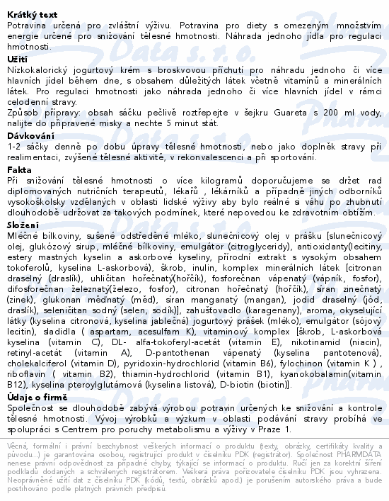 Potravina určená pro zvláštní výživu. Potravina pro diety s omezeným množstvím energie určené pro snižování tělesné hmotnosti. Náhrada jednoho jídla pro regulaci hmotnosti.