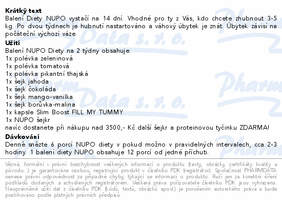 Balení Diety NUPO vystačí na 14 dní. Vhodné pro ty z Vás, kdo chcete zhubnout 3-5 kg. Po dvou týdnech je hubnutí nastartováno a váhový úbytek je znát. Úbytek závisí na počáteční výchozí váze.