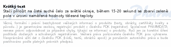 Stačí přiložit na čisté suché čelo za světlé okraje, během 15-20 sekund se zbarví zeleně pole v úrovni naměřené hodnoty tělesné teploty.