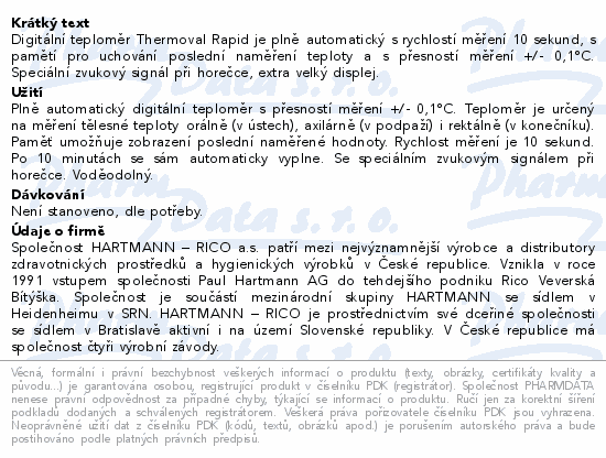 Digitální teploměr Thermoval Rapid je plně automatický s rychlostí měření 10 sekund, s pamětí pro uchování poslední naměření teploty a s přesností měření +/- 0,1°C. Speciální zvukový signál při horečce, extra velký displej.