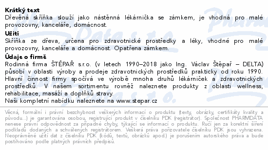 Dřevěná skříňka slouží jako nástěnná lékárnička se zámkem, je vhodná pro malé provozovny, kanceláře, domácnost.