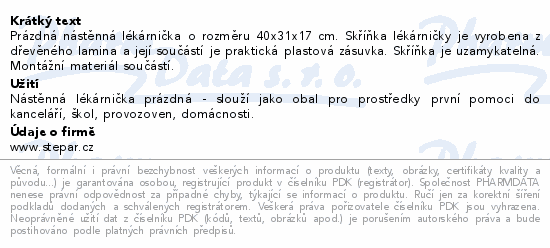 Prázdná nástěnná lékárnička o rozměru 40x31x17 cm. Skříňka lékárničky je vyrobena z dřevěného lamina a její součástí je praktická plastová zásuvka. Skříňka je uzamykatelná. Montážní materiál součástí.