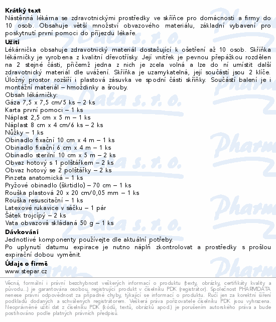 Nástěnná lékárna se zdravotnickými prostředky ve skříňce pro domácnosti a firmy do 10 osob. Obsahuje větší množství obvazového materiálu, základní vybavení pro poskytnutí první pomoci do příjezdu lékaře.