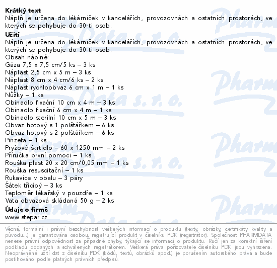 Náplň je určena do lékárniček v kancelářích, provozovnách a ostatních prostorách, ve kterých se pohybuje do 30-ti osob.