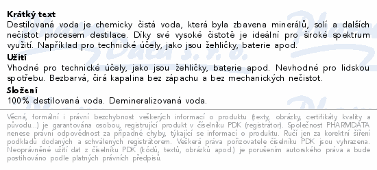 Destilovaná voda je chemicky čistá voda, která byla zbavena minerálů, solí a dalších nečistot procesem destilace. Díky své vysoké čistotě je ideální pro široké spektrum využití. Například pro technické účely, jako jsou žehličky, baterie apod.