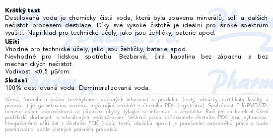 Destilovaná voda je chemicky čistá voda, která byla zbavena minerálů, solí a dalších nečistot procesem destilace. Díky své vysoké čistotě je ideální pro široké spektrum využití. Například pro technické účely, jako jsou žehličky, baterie apod.