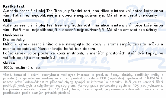 Autentis Esenciální olej Tea Tree je 100% přírodní éterický olej z čajovníku australského, známý svými výraznými čisticími a osvěžujícími vlastnostmi. Tento olej je oblíbený pro široké spektrum využití v aromaterapii, přírodní kosmetice i domácí péči.