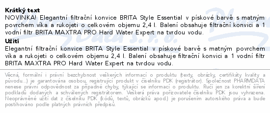 NOVINKA! Elegantní filtrační konvice BRITA Style Essential v pískové barvě s matným povrchem víka a rukojeti o celkovém objemu 2,4 l. Balení obsahuje filtrační konvici a 1 vodní filtr BRITA MAXTRA PRO Hard Water Expert na tvrdou vodu.