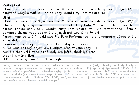 Filtrační konvice Brita Style Essential XL v bílé barvě má celkový objem 3,6 l (2,3 l filtrované vody) a využívá k filtraci vody vodní filtry Brita Maxtra Pro.