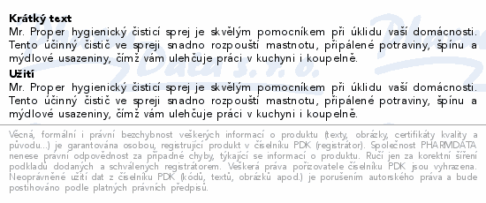 Mr. Proper hygienický čisticí sprej je skvělým pomocníkem při úklidu vaší domácnosti. Tento účinný čistič ve spreji snadno rozpouští mastnotu, připálené potraviny, špínu a mýdlové usazeniny, čímž vám ulehčuje práci v kuchyni i koupelně.