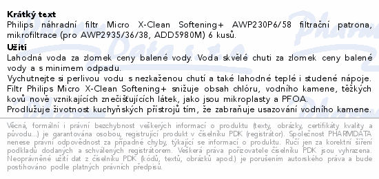 Philips náhradní filtr Micro X-Clean Softening+ AWP230P6/58 filtrační patrona, mikrofiltrace (pro AWP2935/36/38, ADD5980M) 6 kusů.