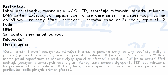 Láhev bez zápachu, technologie UV-C LED, zabraňuje zvětšování zápachu zničením DNA bakterií způsobujících zápach. Jde i o přenosné zařízení na čištění vody, hodí se do přírody i na cesty. 590ml, nerez.ocel, uchovává chlad až 24 hodin, teplo až 12 hodin.