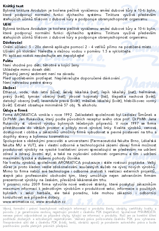 Bylinná tinktura Arodubin je tvořena pečlivě vyváženou směsí dubové kůry a 10-ti bylin, které podporují normální funkci dýchacího systému. Tinktura využívá především stahujících účinků tříslovin z dubové kůry a podporuje obranyschopnost organismu.