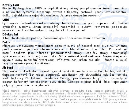 Biotter Byology Alerg PREV je doplněk stravy určený pro přirozenou funkci imunitního a nervového systému. Obsahuje extrakt z třapatky nachové, jinanu dvoulaločného, šišáku bajkalského a čajovníku čínského. Je určen dospělým osobám.