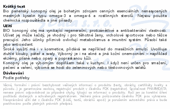 Bio panenský konopný olej je bohatým zdrojem cenných esenciálních nenasycených mastných kyselin typu omega-3 a omega-6 a rostlinných sterolů. Nejsou použita chemická rozpouštědla a jiné přísady.