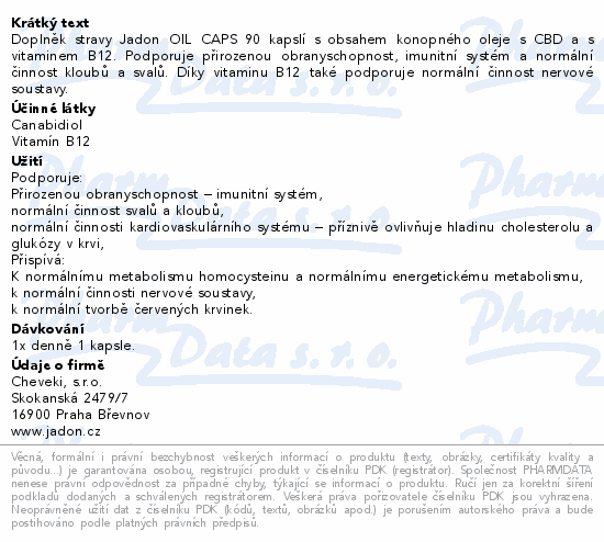 Doplněk stravy Jadon OIL CAPS 90 kapslí s obsahem konopného oleje s CBD a s vitaminem B12. Podporuje přirozenou obranyschopnost, imunitní systém a normální činnost kloubů a svalů. Díky vitaminu B12 také podporuje normální činnost nervové soustavy.