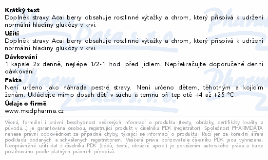 Doplněk stravy Acai berry obsahuje rostlinné výtažky a chrom, který přispívá k udržení normální hladiny glukózy v krvi.