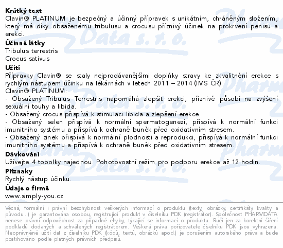 Clavin® PLATINUM je bezpečný a účinný přípravek s unikátním, chráněným složením, který má díky obsaženému tribulusu a crocusu příznivý účinek na prokrvení penisu a erekci.