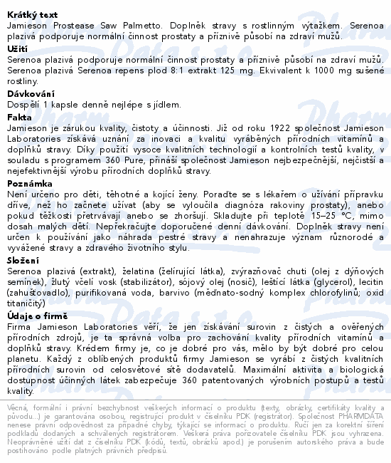 Jamieson Prostease Saw Palmetto. Doplněk stravy s rostlinným výtažkem. Serenoa plazivá podporuje normální činnost prostaty a příznivě působí na zdraví mužů.