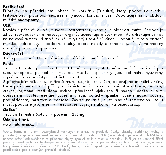 Přípravek na přírodní bázi obsahující kotvičník (Tribulus), který podporuje tvorbu testosteronu, plodnost, sexuální a fyzickou kondici muže. Doporučuje se v období mužské andropauzy.