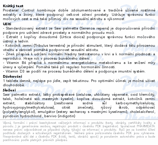Prostenal Control kombinuje dobře zdokumentované a tradičně užívané rostlinné extrakty a živiny, které podporují celkové zdraví prostaty. Udržuje správnou funkci močových cest a má také příznivý vliv na sexuální aktivitu a výkonnost.