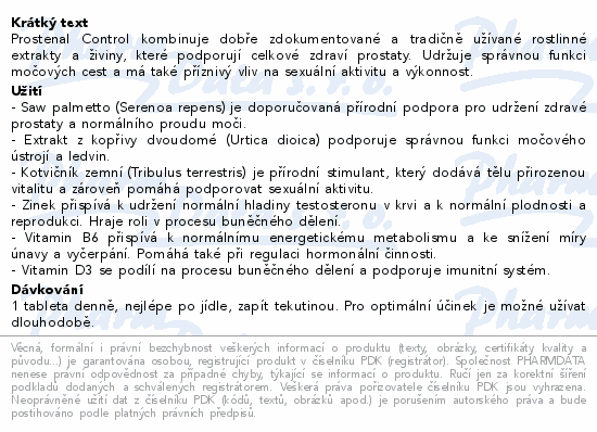 Prostenal Control kombinuje dobře zdokumentované a tradičně užívané rostlinné extrakty a živiny, které podporují celkové zdraví prostaty. Udržuje správnou funkci močových cest a má také příznivý vliv na sexuální aktivitu a výkonnost.