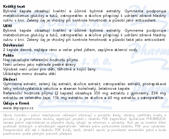Bylinné kapsle obsahují kvalitní a účinné bylinné extrakty. Gymnema podporuje metabolizmus glukózy a tuků, ostropestřec a skořice přispívají k udržení zdravé hladiny cukru v krvi. Zelený čaj je vhodný při kontrole hmotnosti a působí jako antioxidant.