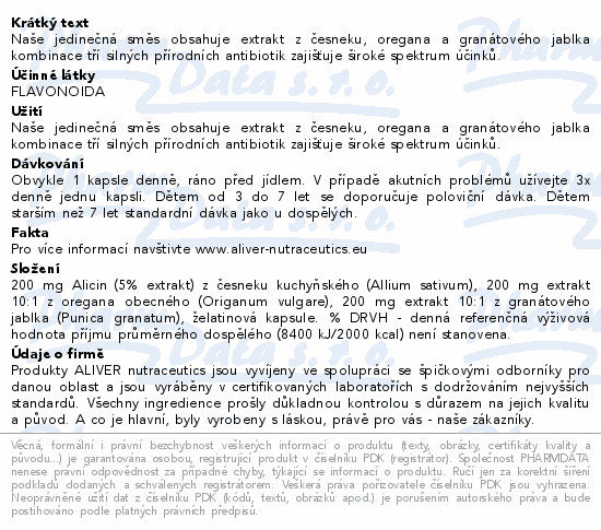 Naše jedinečná směs obsahuje extrakt z česneku, oregana a granátového jablka kombinace tří silných přírodních antibiotik zajišťuje široké spektrum účinků.