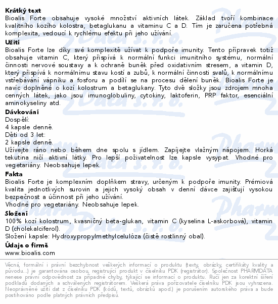 Bioalis Forte obsahuje vysoké množství aktivních látek. Základ tvoří kombinace kvalitního kozího kolostra, betaglukanu a vitaminu C a D. Tím je zaručena potřebná komplexita, vedoucí k rychlému efektu při jeho užívání.