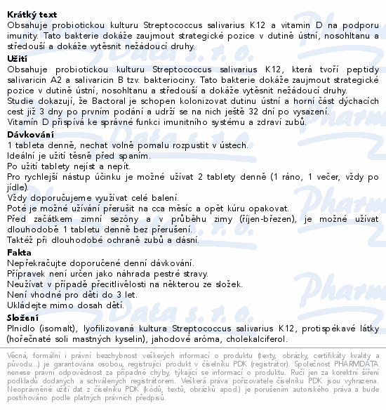 Obsahuje probiotickou kulturu Streptococcus salivarius K12 a vitamin D na podporu imunity. Tato bakterie dokáže zaujmout strategické pozice v dutině ústní, nosohltanu a středouší a dokáže vytěsnit nežádoucí druhy.