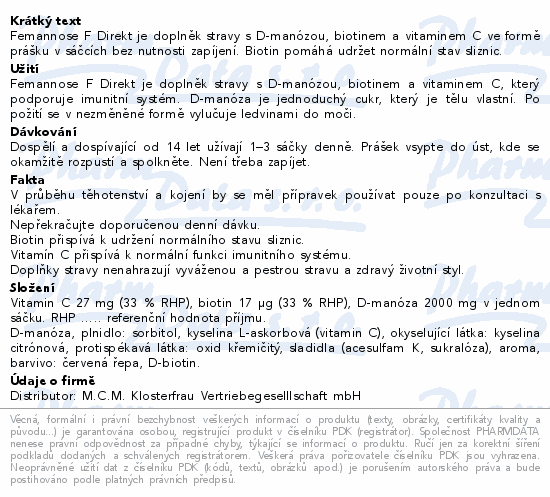 Doplněk stravy s D-manózou, biotinem a vitamínem C. Obsahuje cukr a sladidla. Biotin přispívá k udržení normálního stavu sliznic. Vitamín C přispívá k normální funkci imunitního systému.