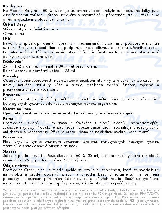 EkoMedica Rakytník 100 % šťáva je získávána z plodů rakytníku, obsažené látky jsou díky šetrnému způsobu výroby uchovány v maximálně v přirozeném stavu. Šťáva je ve směsi s výtažkem z plodu camu camu.