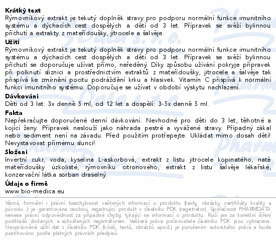 Rýmovníkový extrakt je tekutý doplněk stravy pro podporu normální funkce imunitního systému a dýchacích cest dospělých a dětí od 3 let. Přípravek se svěží bylinnou příchutí a extrakty z mateřídoušky, jitrocele a šalvěje.
