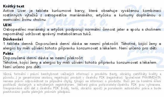 Active Liver je tableta kurkumové barvy, která obsahuje vyváženou kombinaci rostlinných výtažků z ostropestřce mariánského, artyčoku a kurkumy doplněnou o esenciální živinu cholinu.