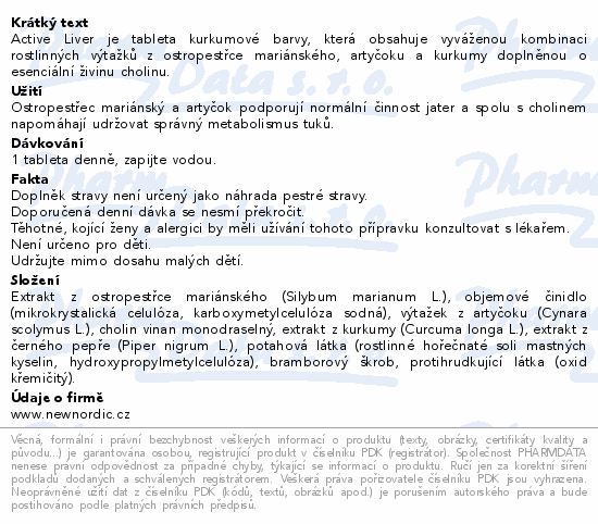 Active Liver je tableta kurkumové barvy, která obsahuje vyváženou kombinaci rostlinných výtažků z ostropestřce mariánského, artyčoku a kurkumy doplněnou o esenciální živinu cholinu.